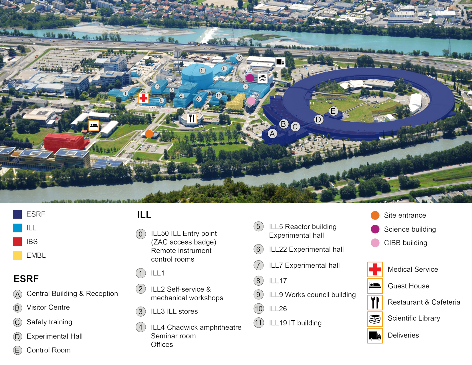 All oral presentations will be held in the ESRF auditorium (A in the map below) during the entire week, and the tutorials will take place in smaller seminar rooms at the ESRF and the ILL.