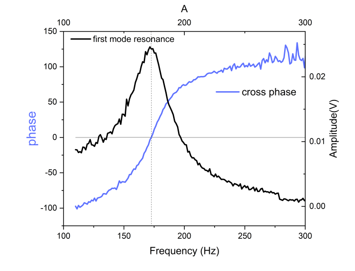 Figure 1. Cross spectrum between exciting e.m. field and interferometric signal (blue) for the first resonance of the capillary mode (black).