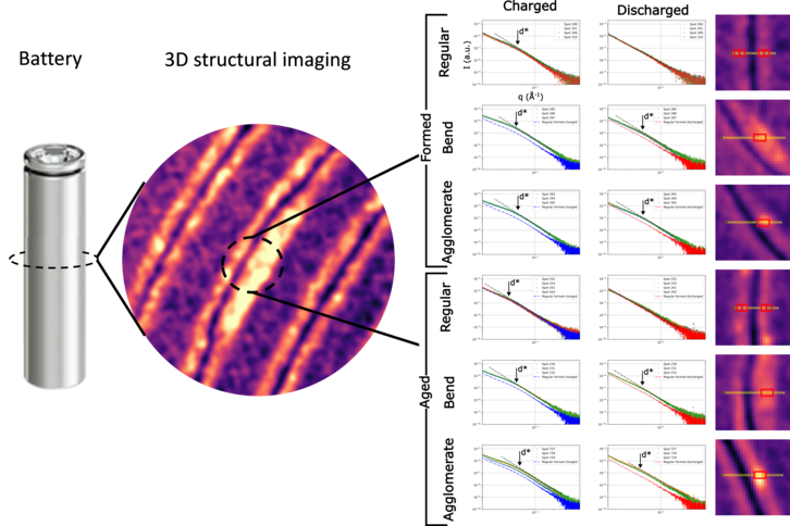 Figure 1. 3D imaging of the interior of a battery using SAXS-CT, enabling to reveal specific defects and areas not lithiating correctly due to active material aggregation [1].