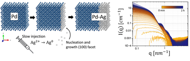 Figure 1. Schematic illustration of Pd-Ag growth through controlled injection rate (left). In-situ SAXS patterns of palladium seed growth (right).